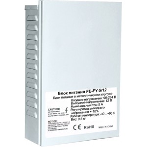 - FE-FY-5/12 Блок питания в металлическом корпусе . Входное напряжение 90-264V, Выходное 12V, Номинальный ток 5A, Регулировка выходного напряжения ± 10%, Рабочая температура -30 +60С, Вес 0,5кг.